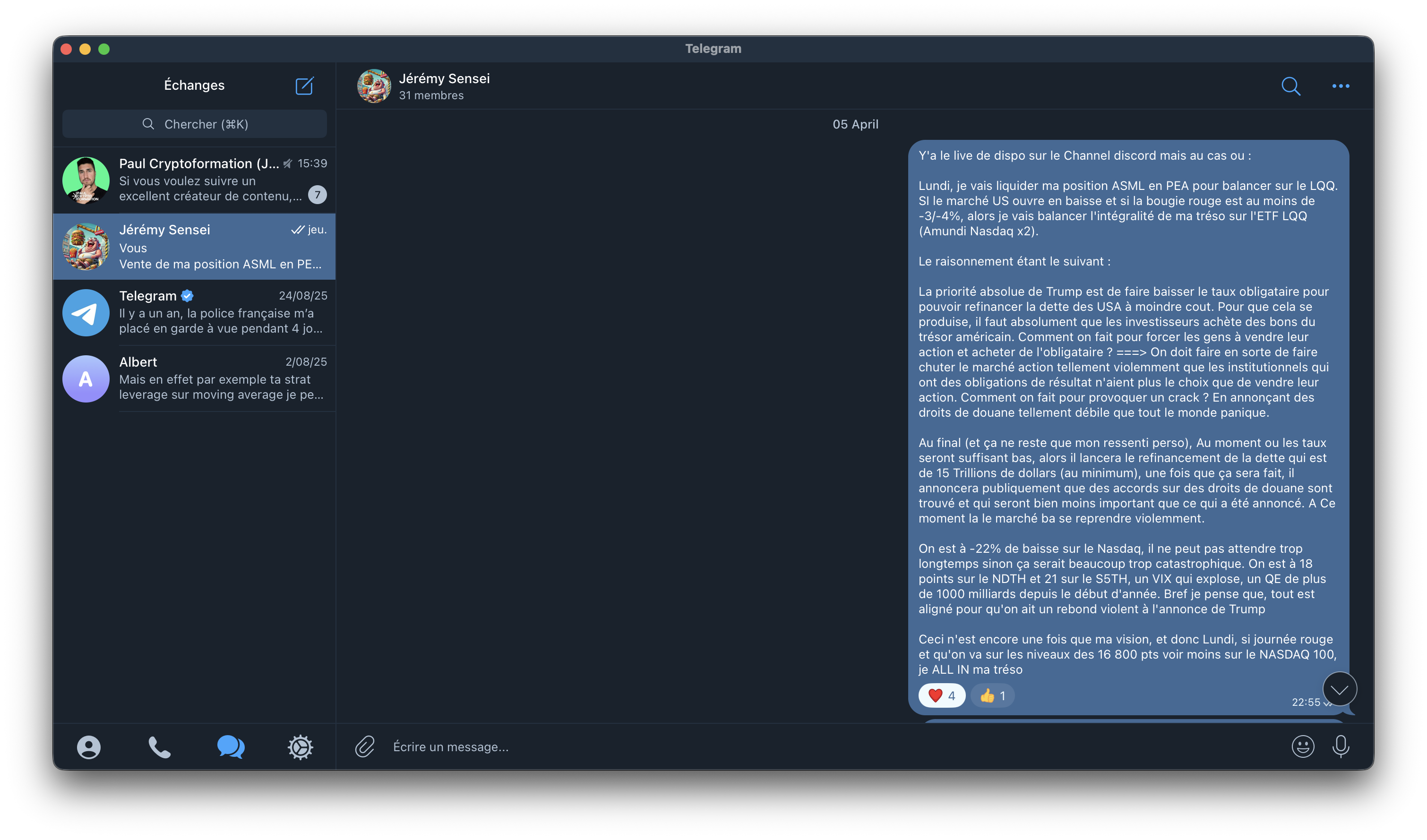 Exemple : Le call du 5 Avril 2025 qui nous a permis de prendre position le 7 Avril, soit le jour le plus bas lors de la mini-crise des droits de douane.