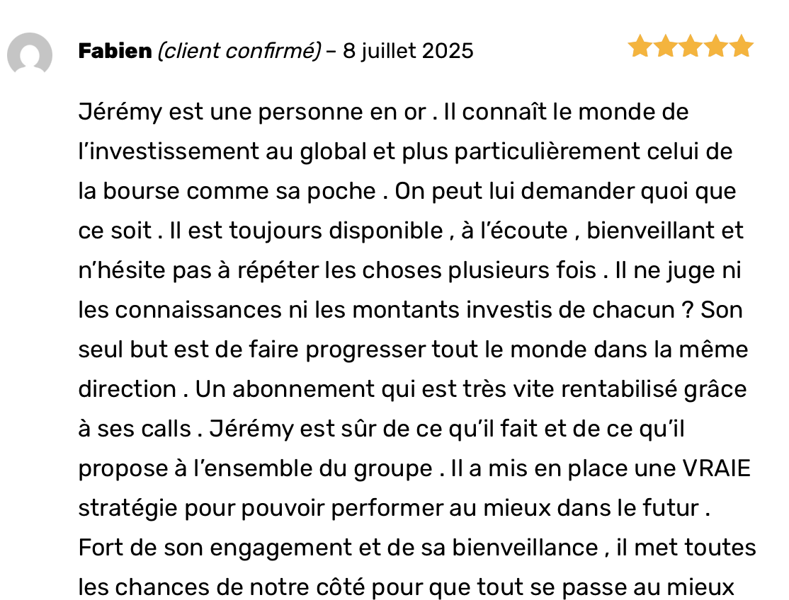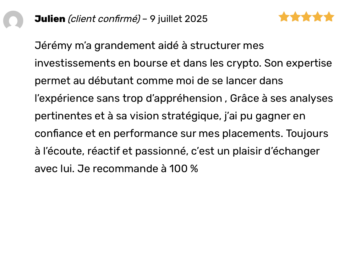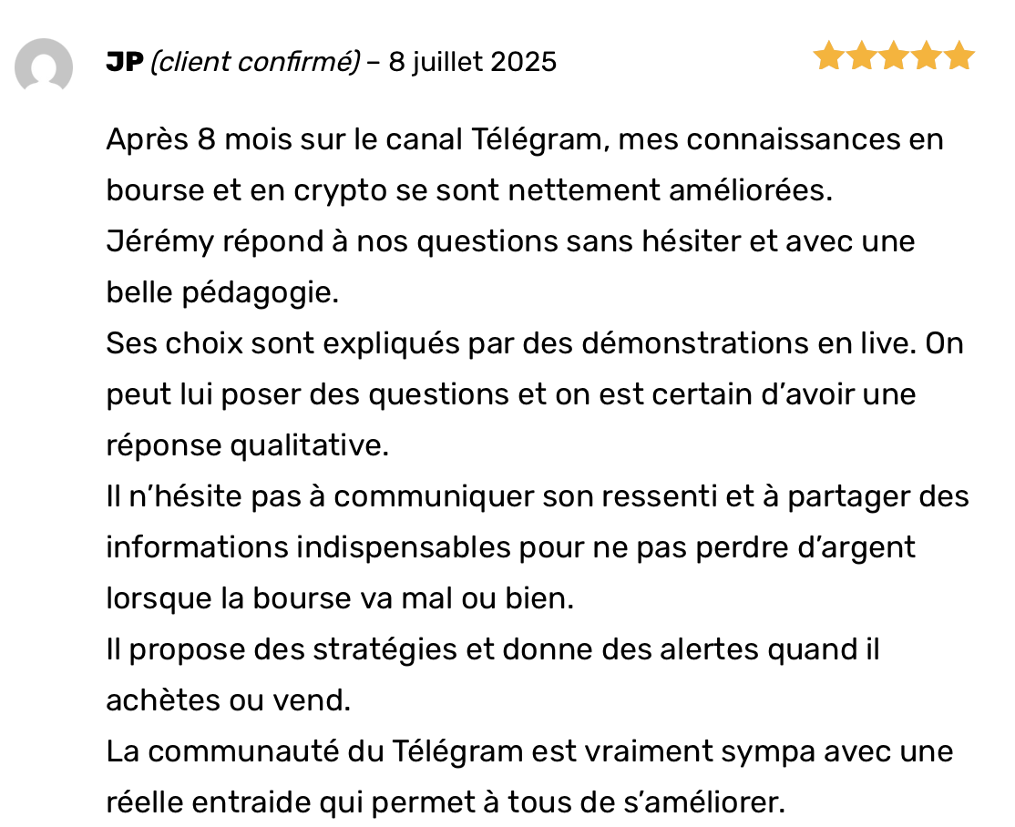 Des sessions de formation en direct : Je t'invite à des lives privés réguliers pour décortiquer ensemble l'actualité des marchés, analyser en profondeur mes positions et la logique derrière chaque choix.