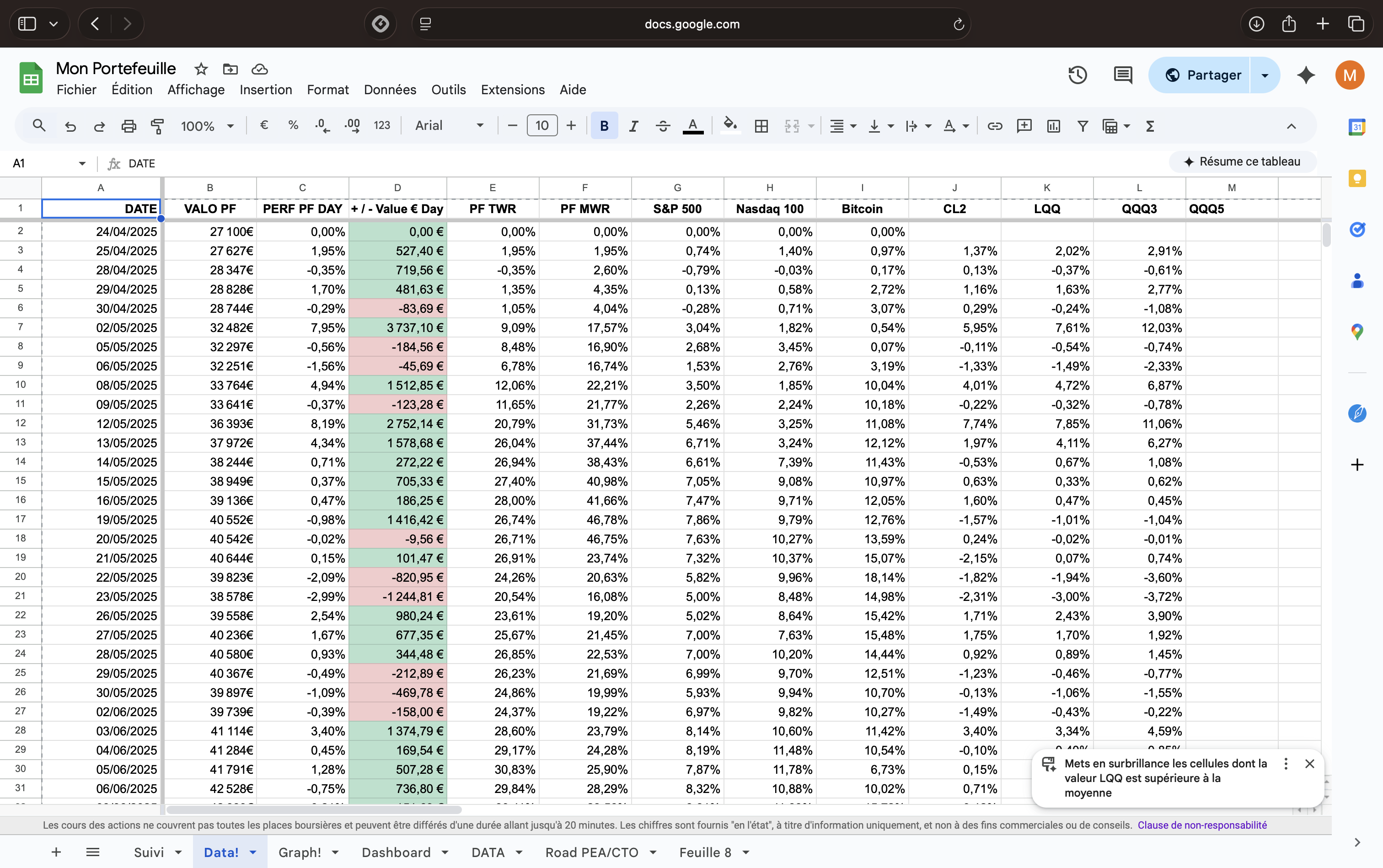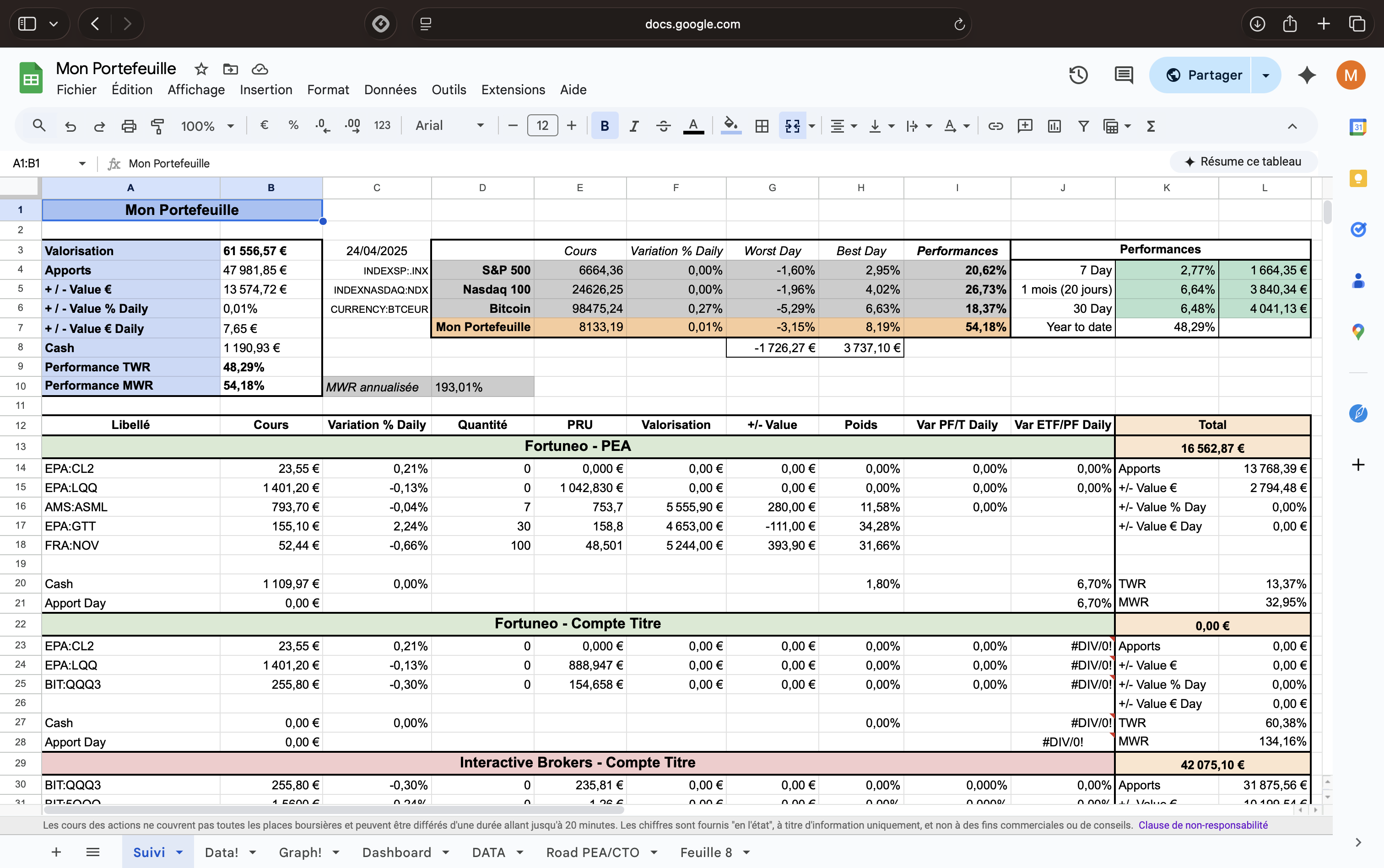 ✅ Partage de l'ensemble de mon Portefeuille en temps réel : Tu as accès au fichier GoogleSheet avec l'ensemble des mes comptes bourses et de leurs positions en temps réel.