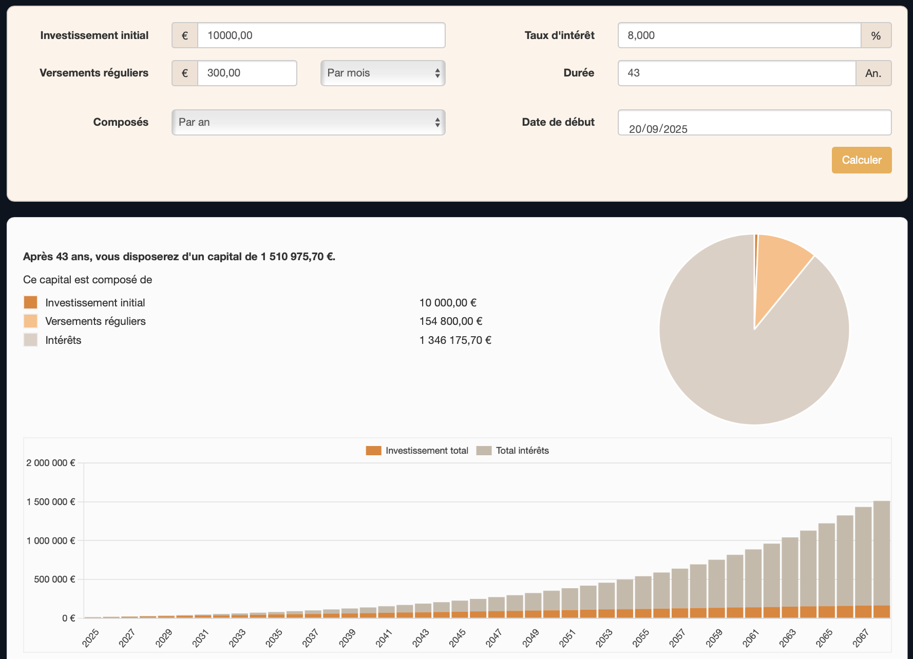 Voici ce que donne un plan d'investissement avec 10,000€ au départ, avec un ajout de 300€ par mois à 8% (rendement moyen de la bourse) pendant 43 ans.